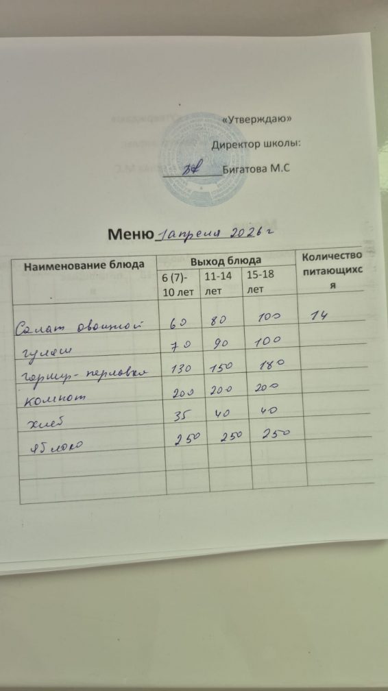 2026 жылдың 1 сәуіріне арналған мәзір