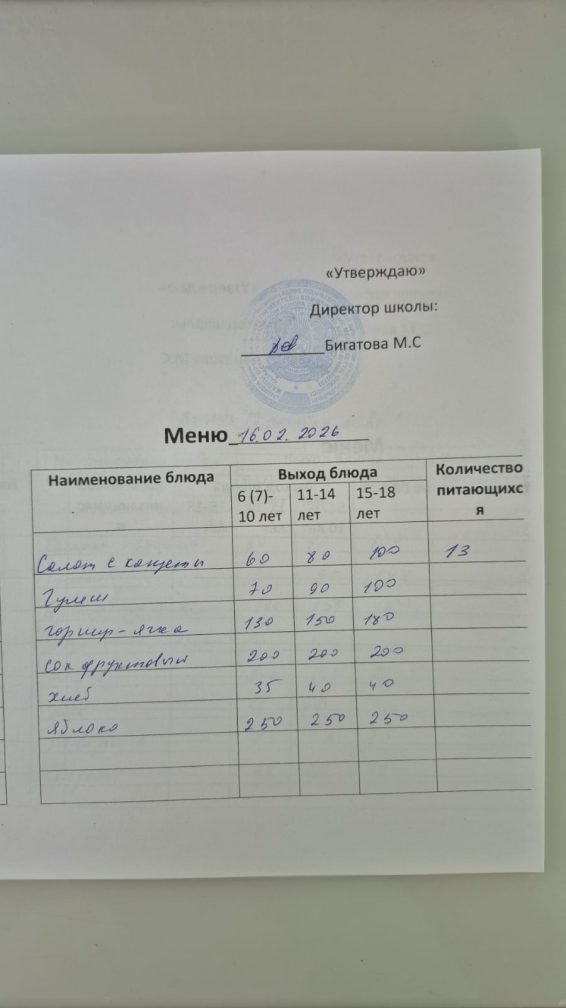 2026 жылғы 16 ақпандағы мәзір