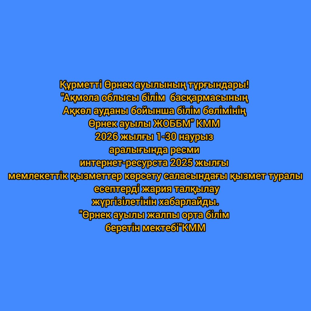 Уважаемые жители села Орнек! КГУ «Общеобразовательная школа села Орнек отдела образования по Аккольскому району управления образования Акмолинской области» сообщает, что в период с 1 по 30 марта 2026 года, на официальном интернет-ресурсе будет проведено публичное обсуждение отчетов о деятельности в сфере оказания государственных услуг за 2025 год. КГУ«Общеобразовательная школа села Орнек »